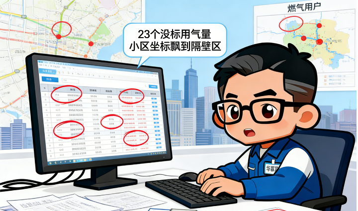 上回清完管网数据的坑,我正想喘口气,转身打开用户数据表 —— 瞬间被屏幕上的红圈整懵了:341 个用户里,23 个没标用气量,还有个小区的坐标直接飘到了隔壁区!